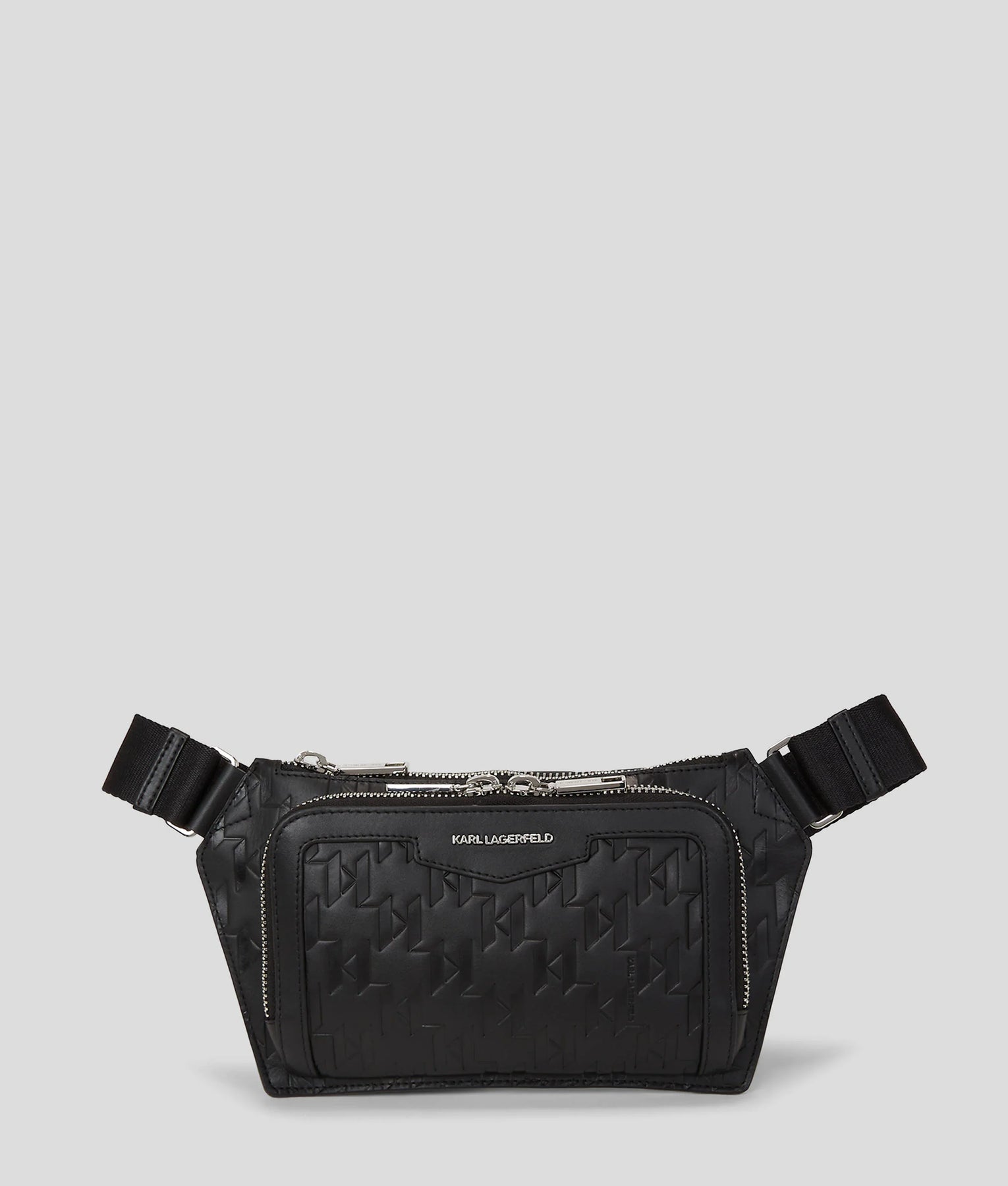 The adjustable strap with metal buckle closure on this sleek KARL LAGERFELD bum bag ensures a perfect fit, while an all-over embossed KL monogram design adds a touch of sophistication. The two-way zip closure and front pocket cater to easy access and organization.