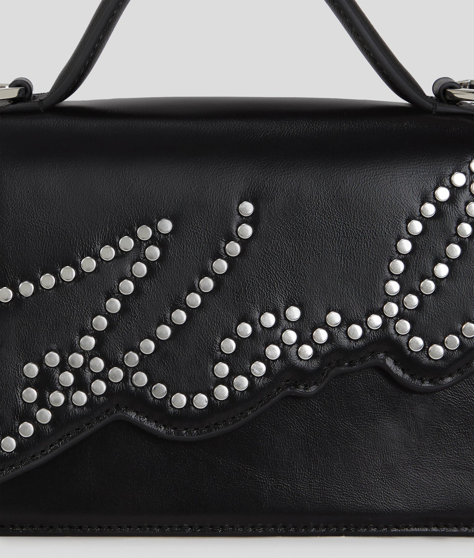 Add rock chic vibes to any outfit with this studded crossbody bag. Featuring a magnetic pin flap closure, it offers easy access while the edgy chain detailing adds a bold touch. The statement Karl Signature logo enhances its unique character, complemented by a small top handle and a detachable strap for multiple styling options.