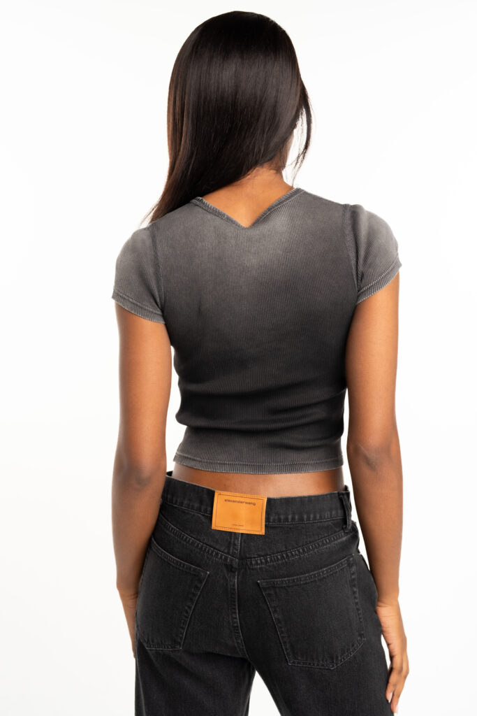 A crystal hotfix logo lights up this cotton ribbed t-shirt. The ash-grey bodycon top features a unique wash that enhances its bold graphic design.
