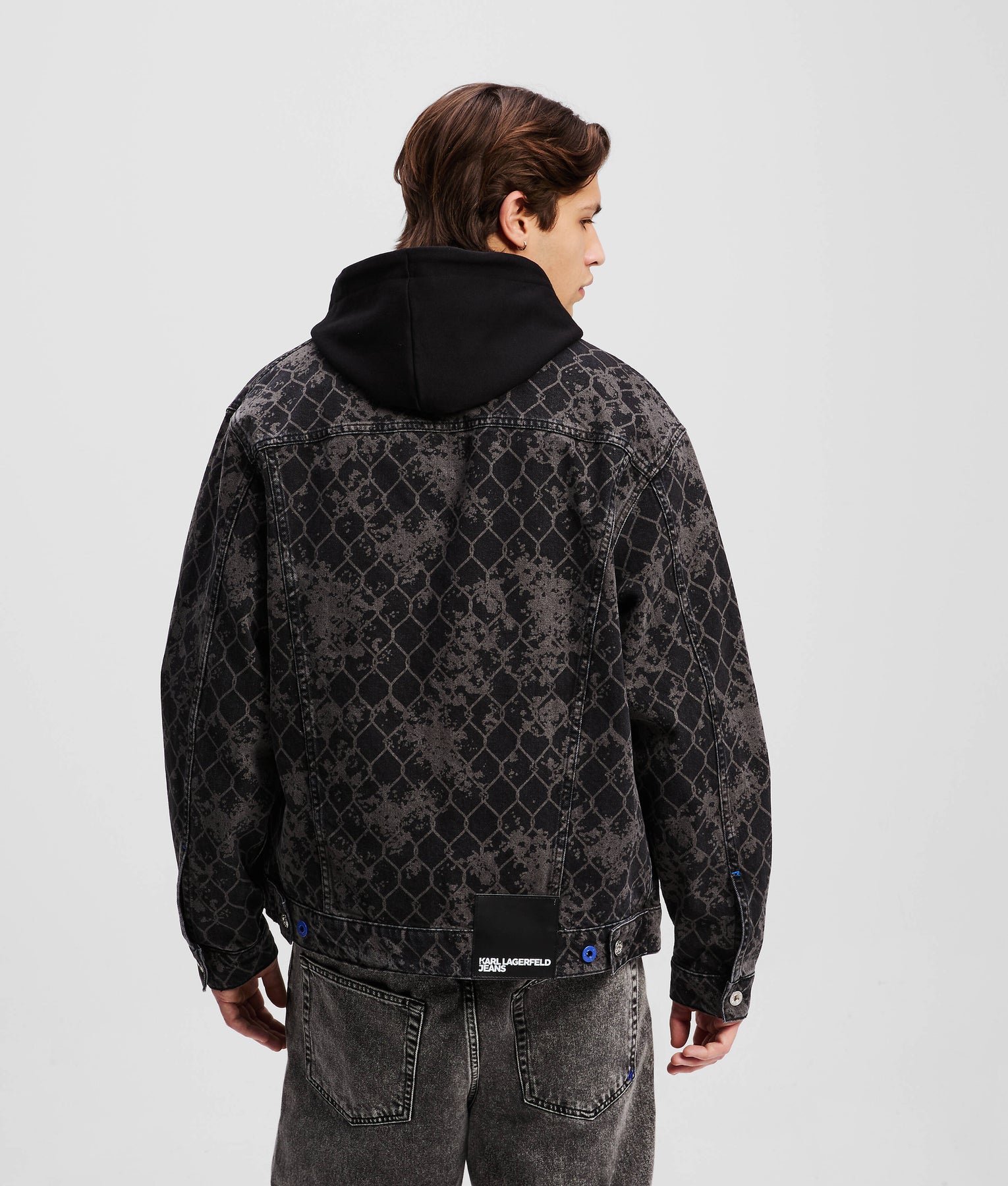 Timeless design with a contemporary twist, this relax-fit denim jacket showcases a bold all-over chain link design that exudes individuality. A branded shank button fastening and practical pockets are complemented by a signature KARL LAGERFELD JEANS leather patch, making this a must-have piece for those who dare to stand out.