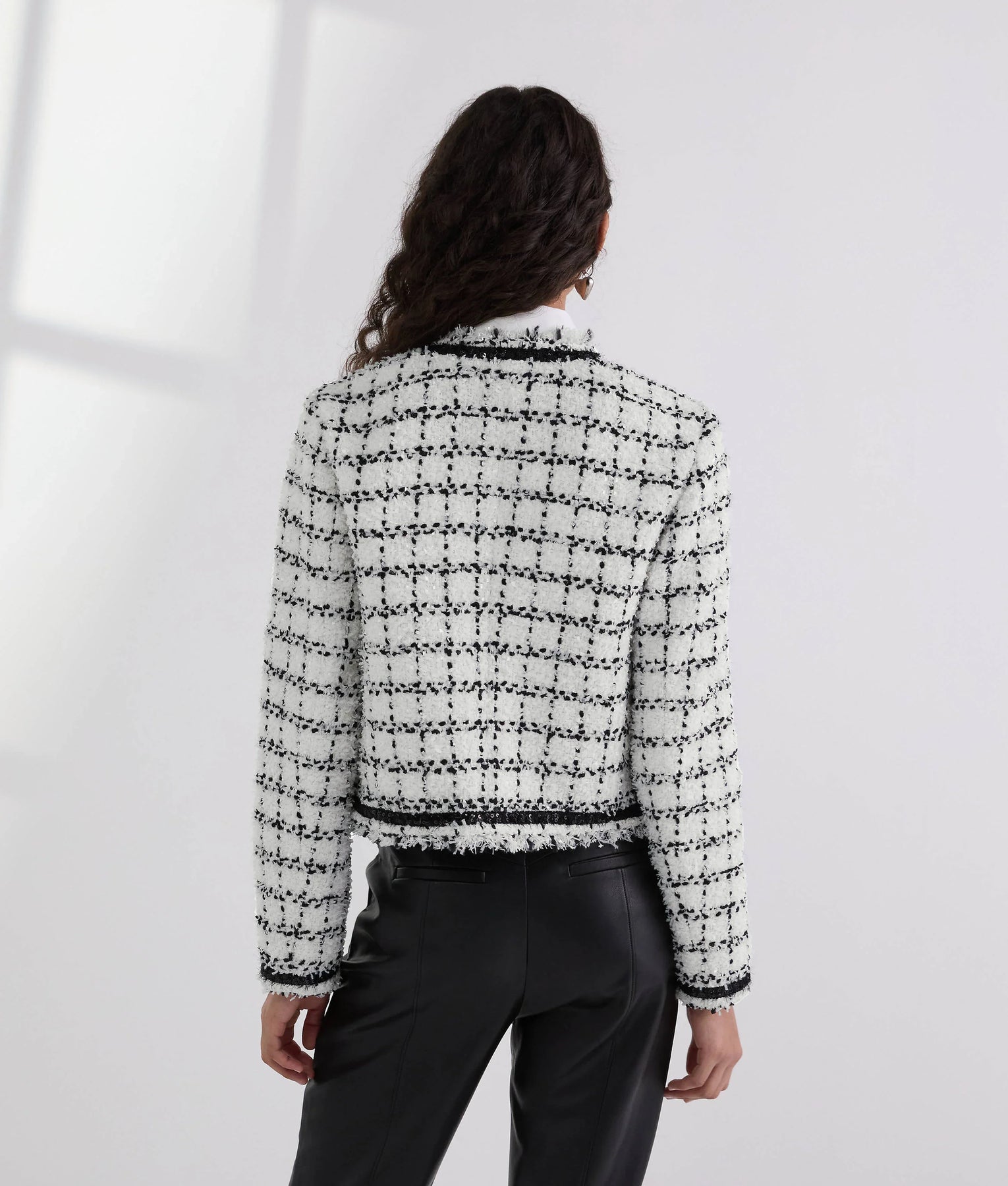 An exquisite blend of texture and style, this bouclé jacket features a refined single-breasted silhouette. The iconic KARL LAGERFELD aesthetic shines through with embellished buttons and contrasting satin accents for a sophisticated finish.