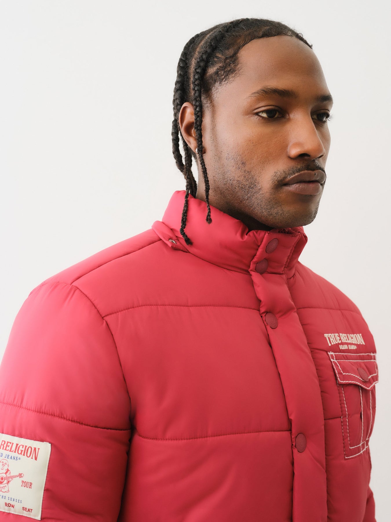 Stay warm and stylish with the True Religion Big T Fur Hood Puffer Jacket in Red Dahlia. Designed to provide exceptional insulation, this jacket features a cozy fur-lined hood that adds both comfort and flair. Its vibrant red hue makes a bold statement, perfect for those who want to stand out while battling the chill. Combining fashion with function, this puffer jacket is ideal for staying comfortable on cold days without compromising on style.