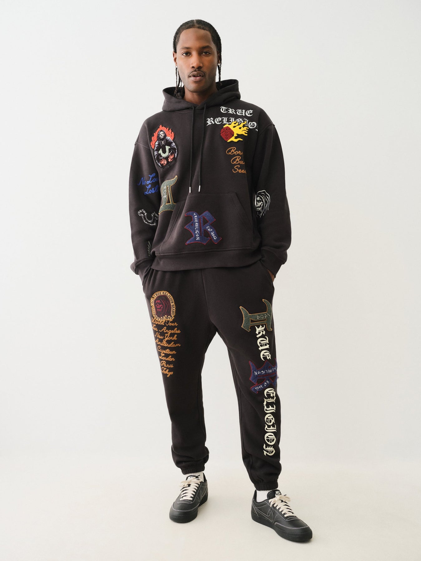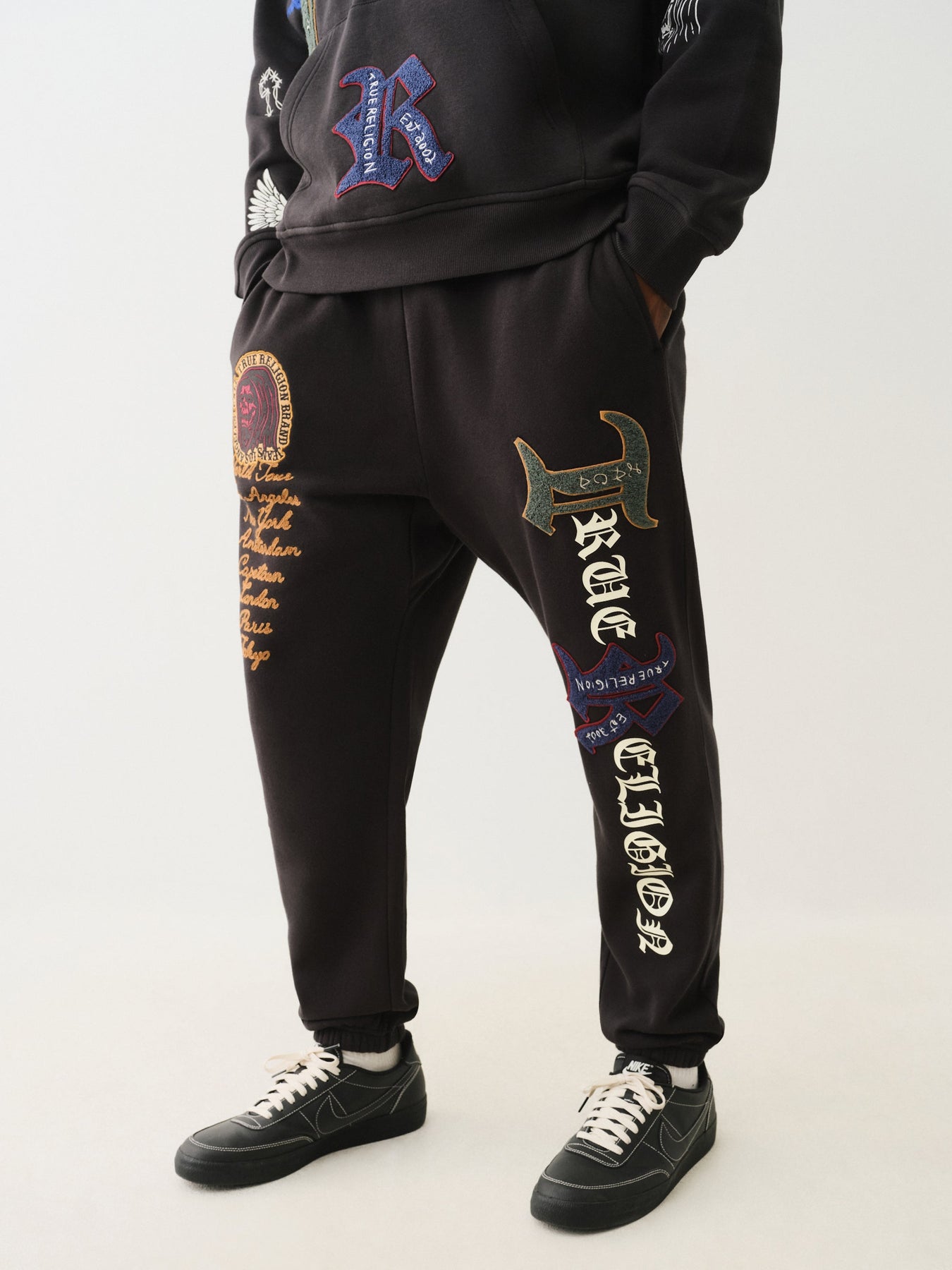 Experience unmatched comfort and style with the True Religion Patch Embro Jogger in Jet Black. Crafted for a sleek, modern look, these joggers feature detailed embroidery patches that add a bold, distinctive touch. Perfect for casual outings or relaxed weekends, their premium fabric ensures softness and durability while providing a flattering fit. Elevate your wardrobe essentials with these versatile joggers that balance streetwear edge with everyday comfort.